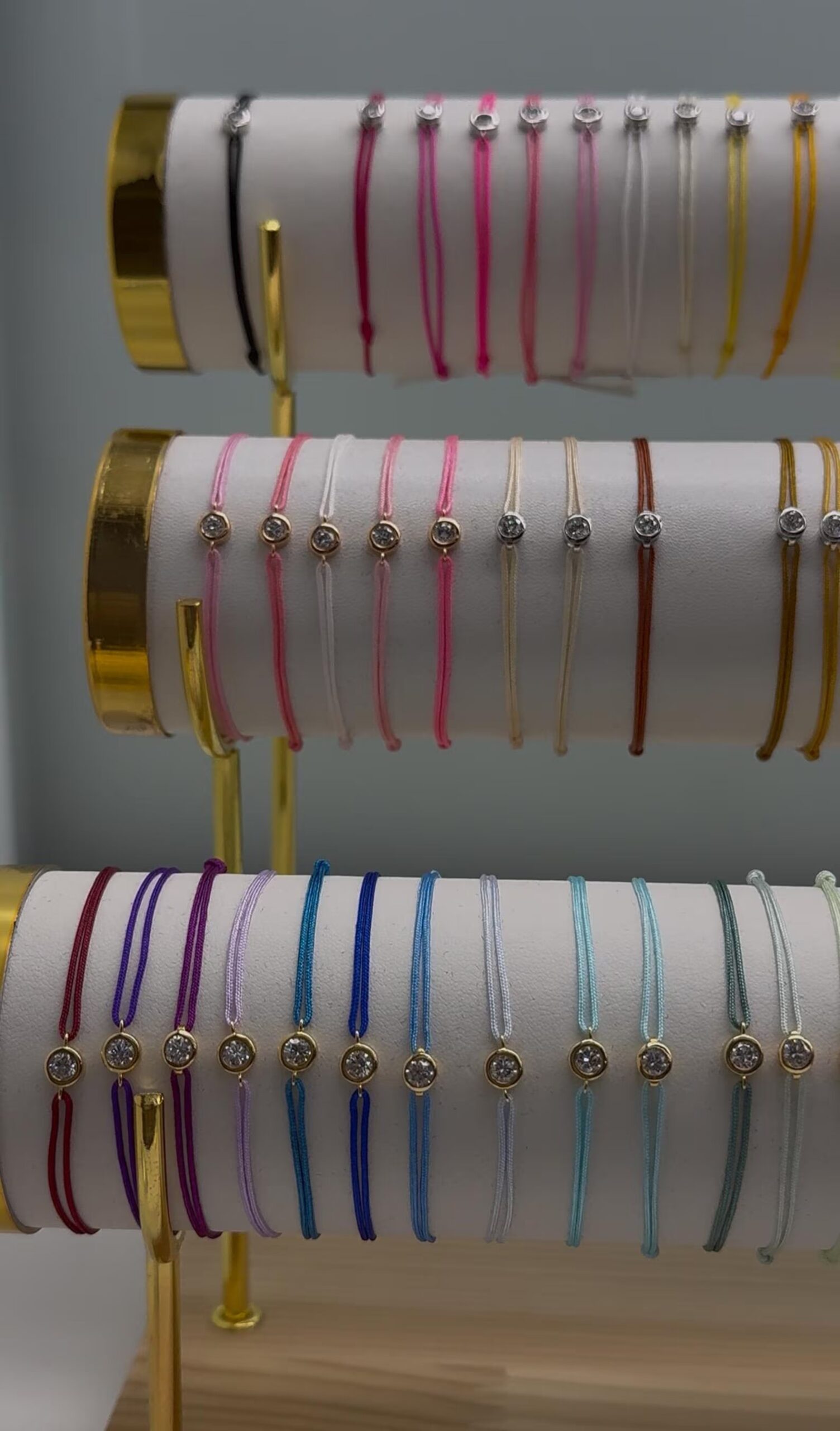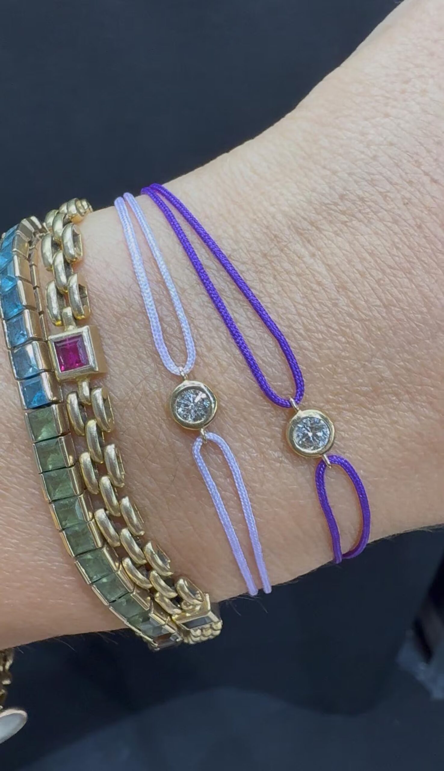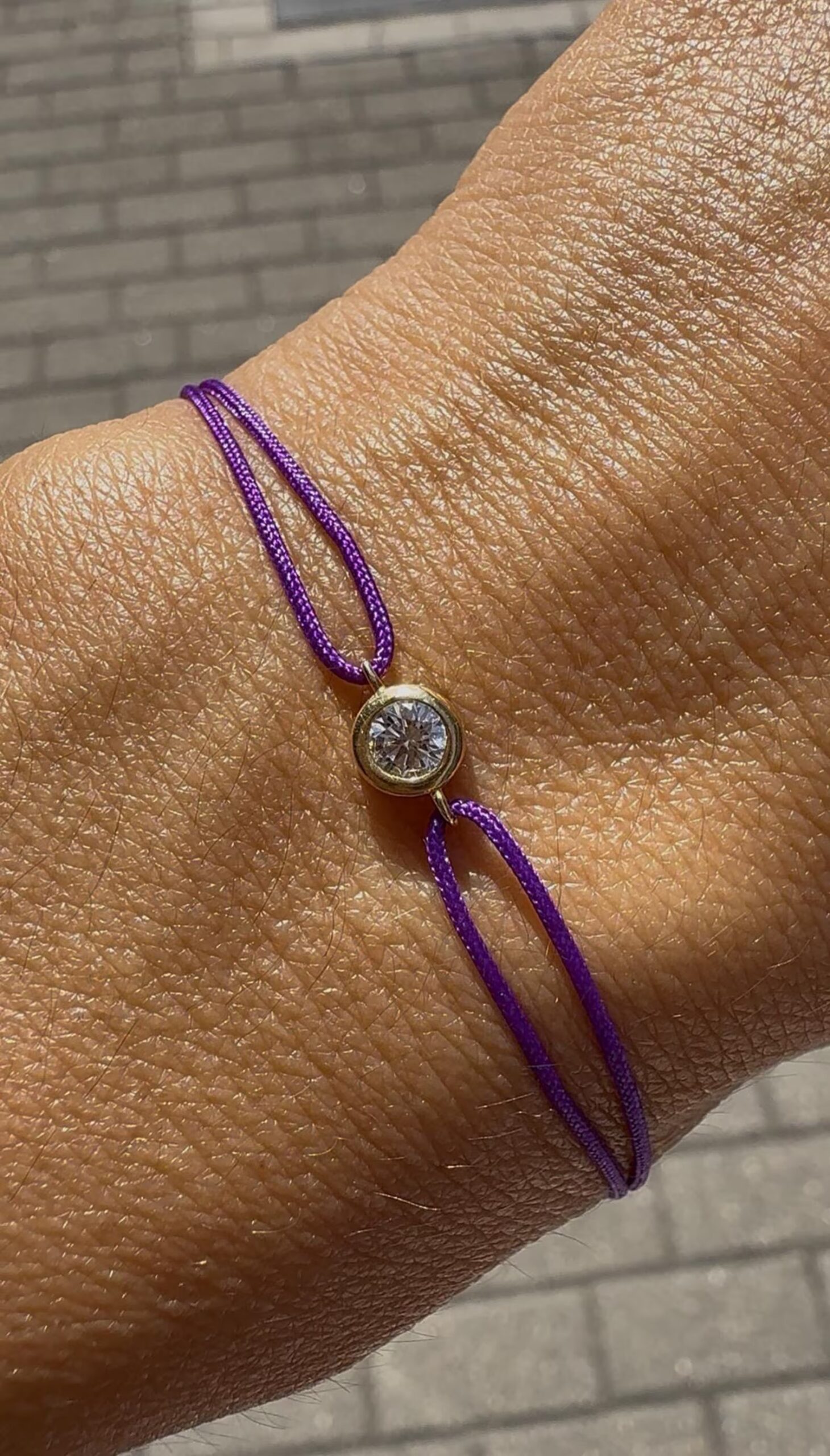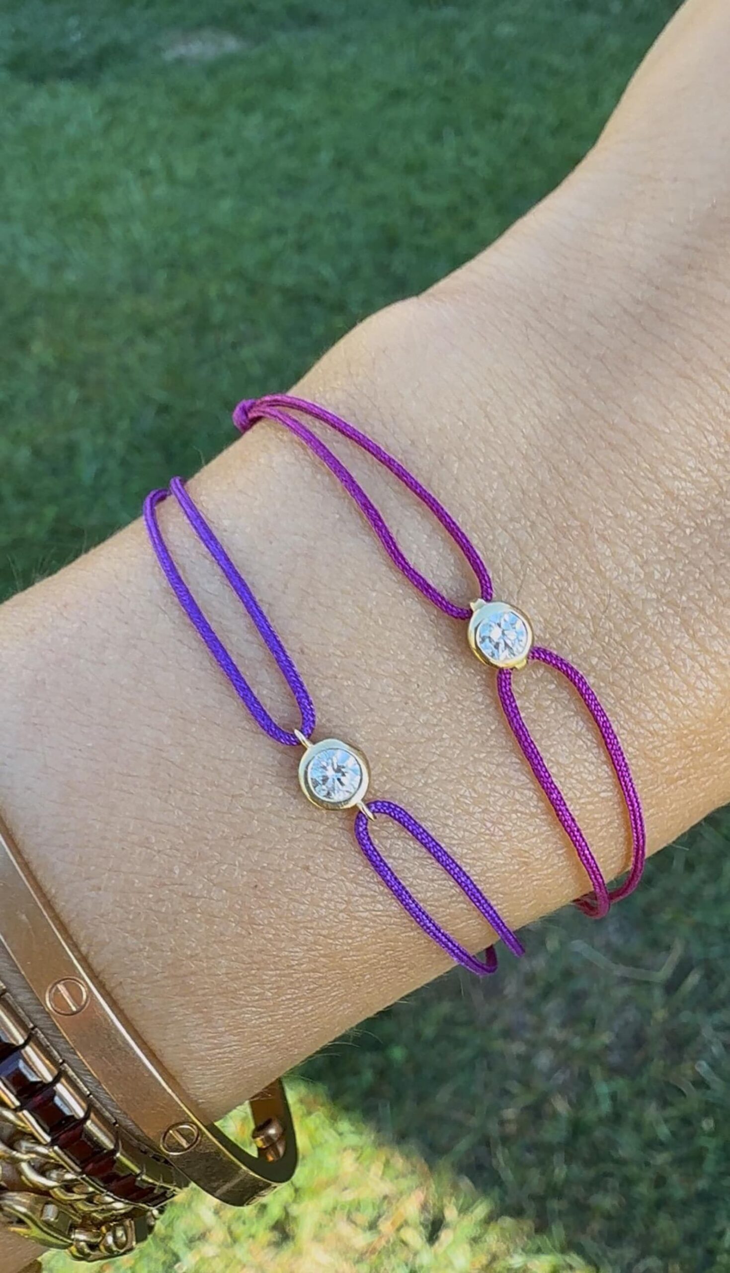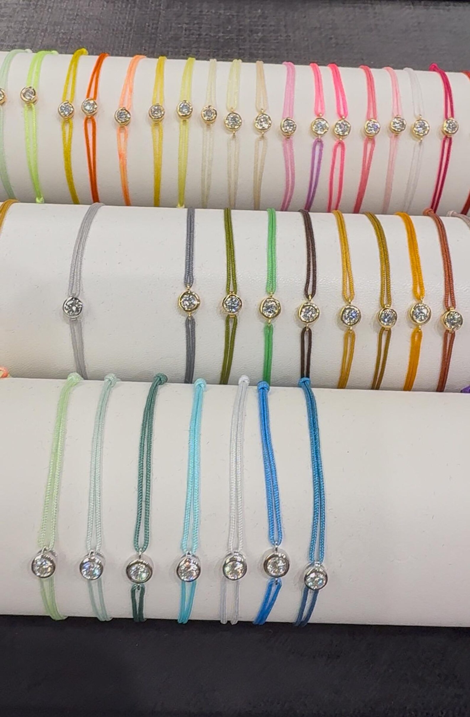 Each bracelet features a 0.20 ct lab-grown diamond (round brilliant cut, D color, VS clarity) set in solid 18k gold, available in yellow, rose, or white gold, and mounted on a durable, waterproof cord in the color of your choice.