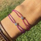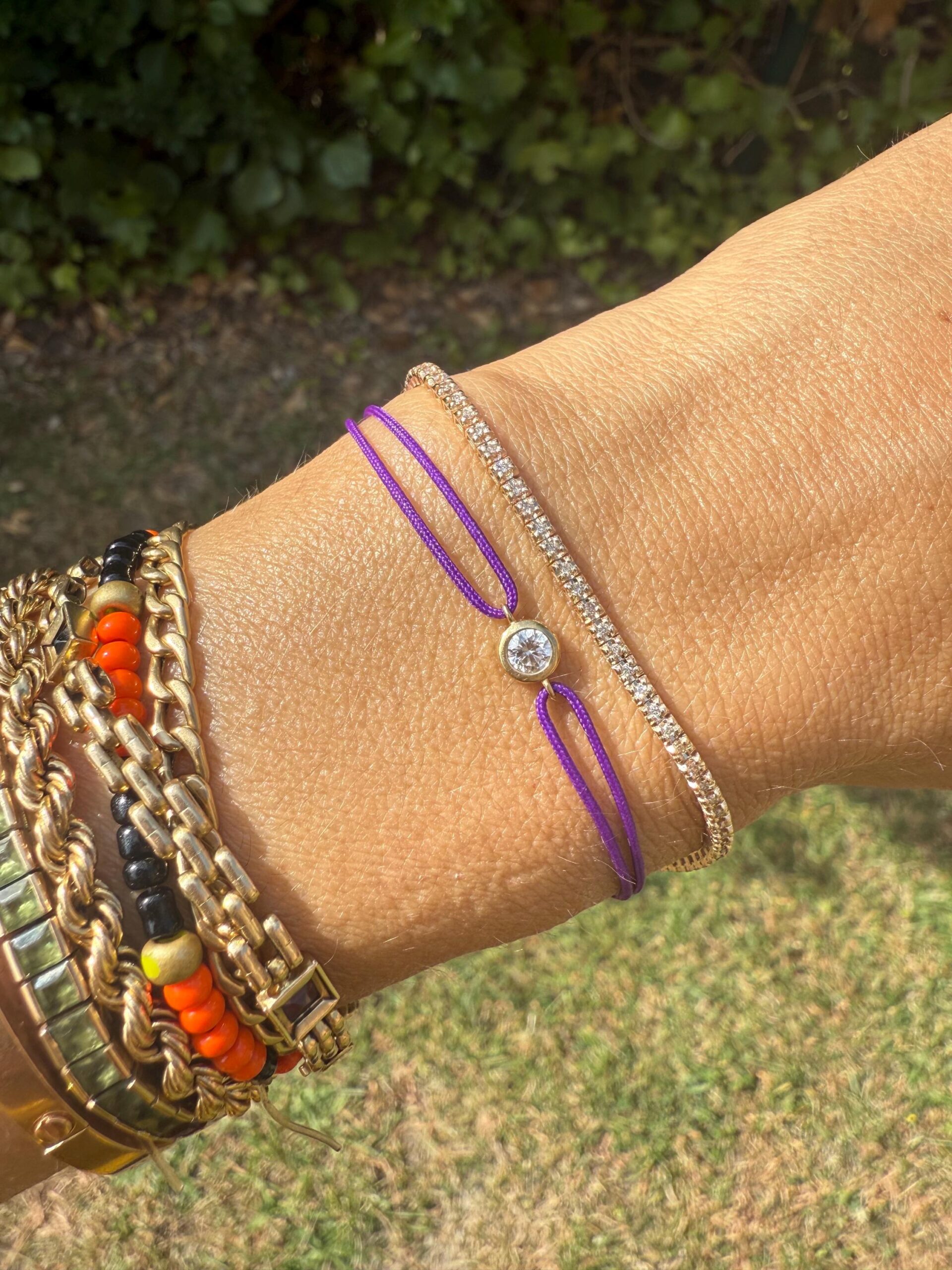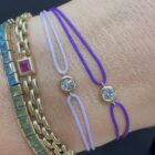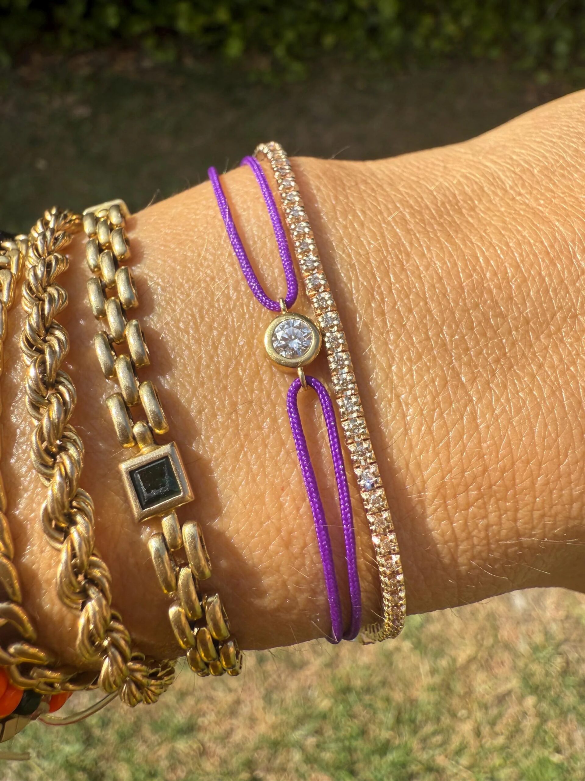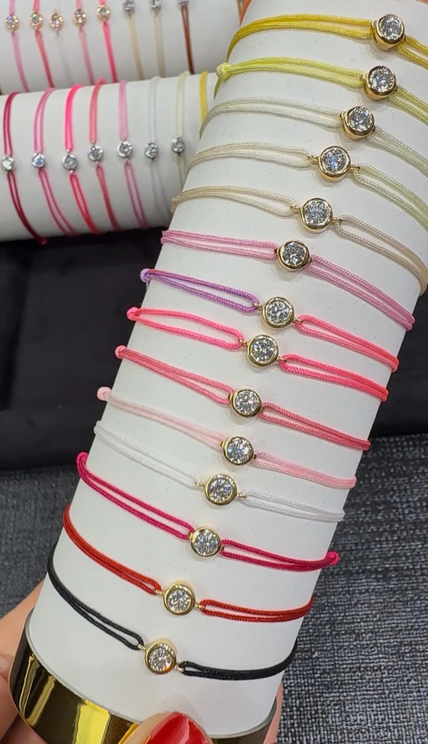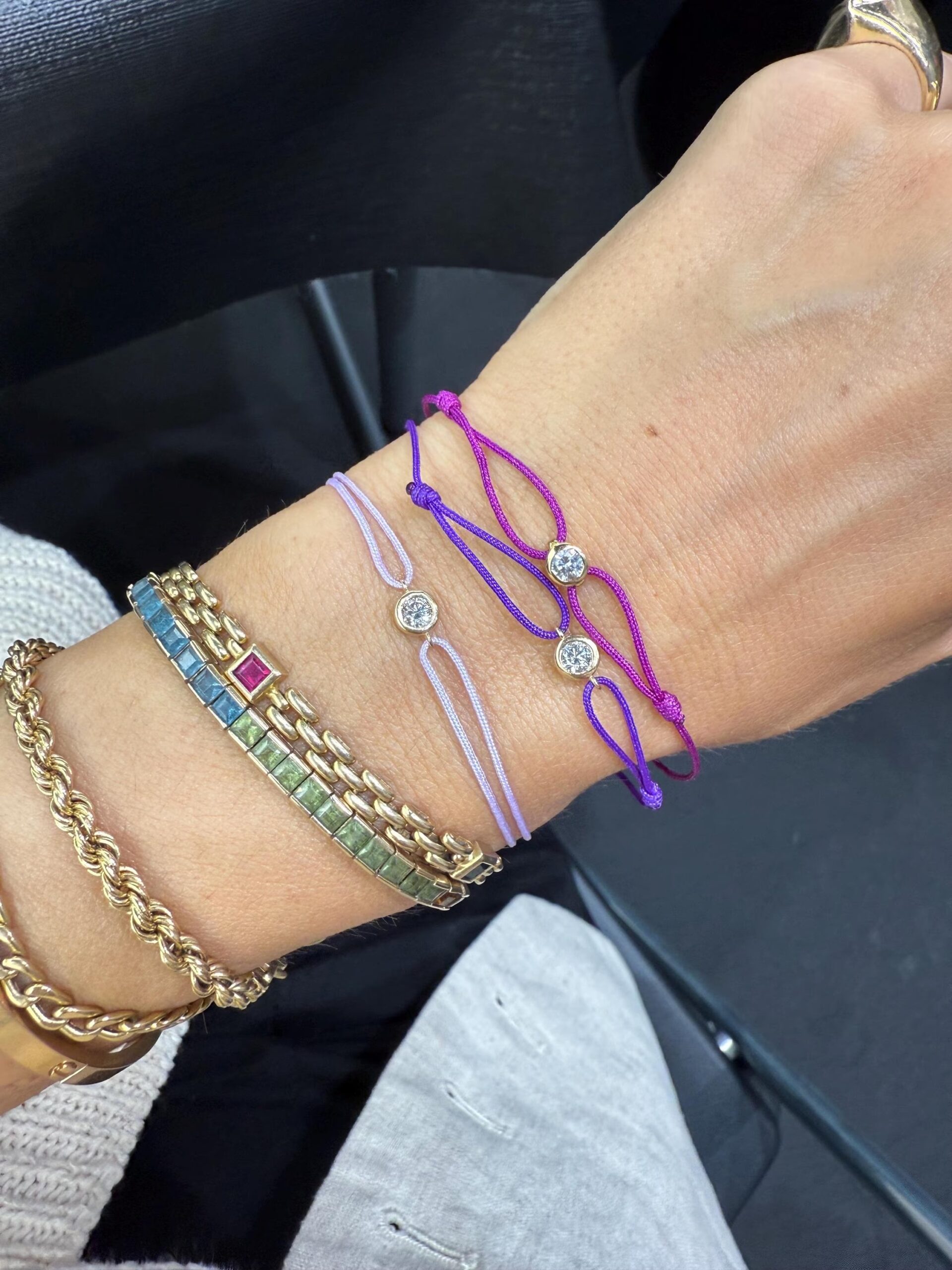 Each bracelet features a 0.20 ct lab-grown diamond (round brilliant cut, D color, VS clarity) set in solid 18k gold, available in yellow, rose, or white gold, and mounted on a durable, waterproof cord in the color of your choice.