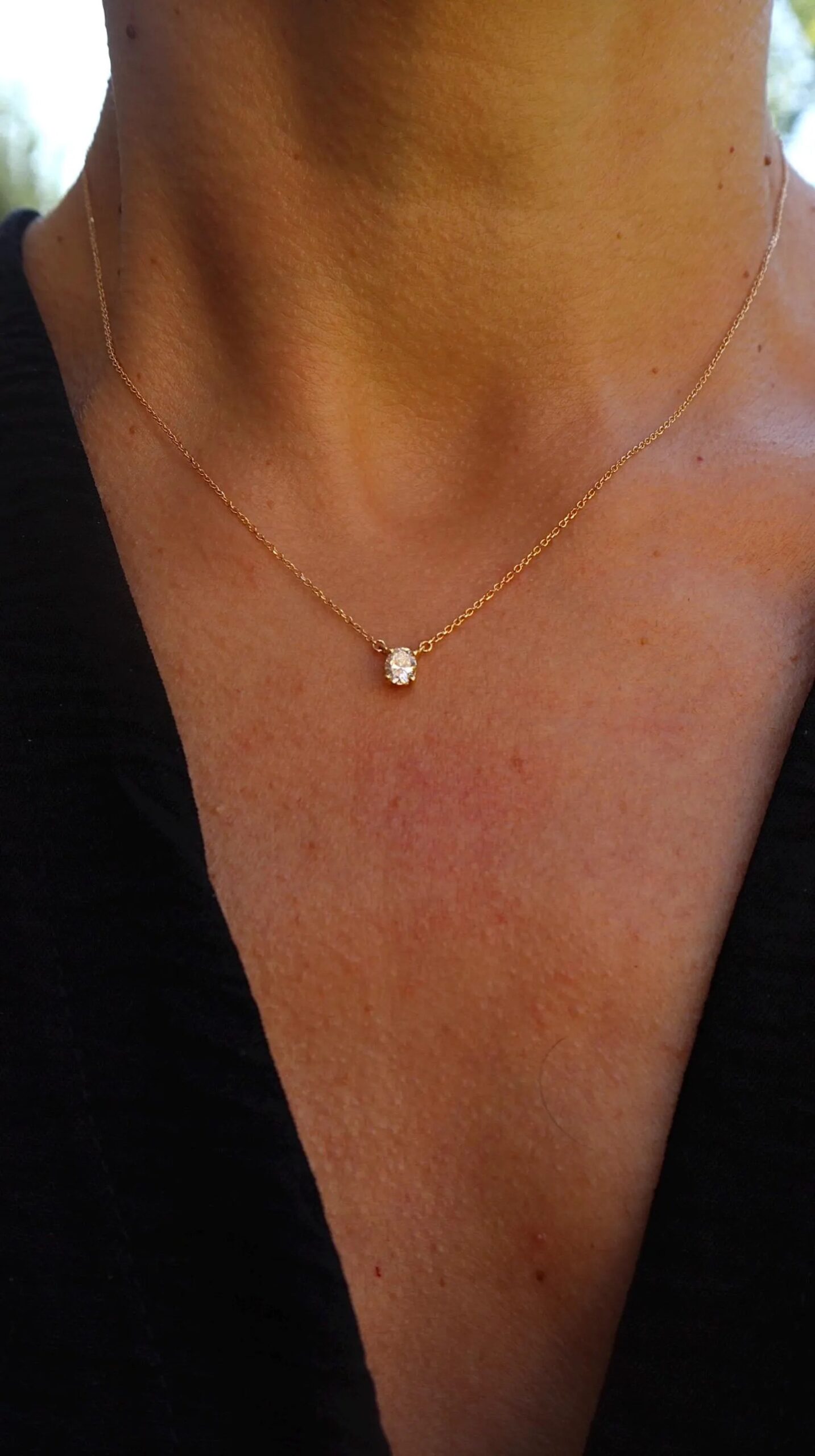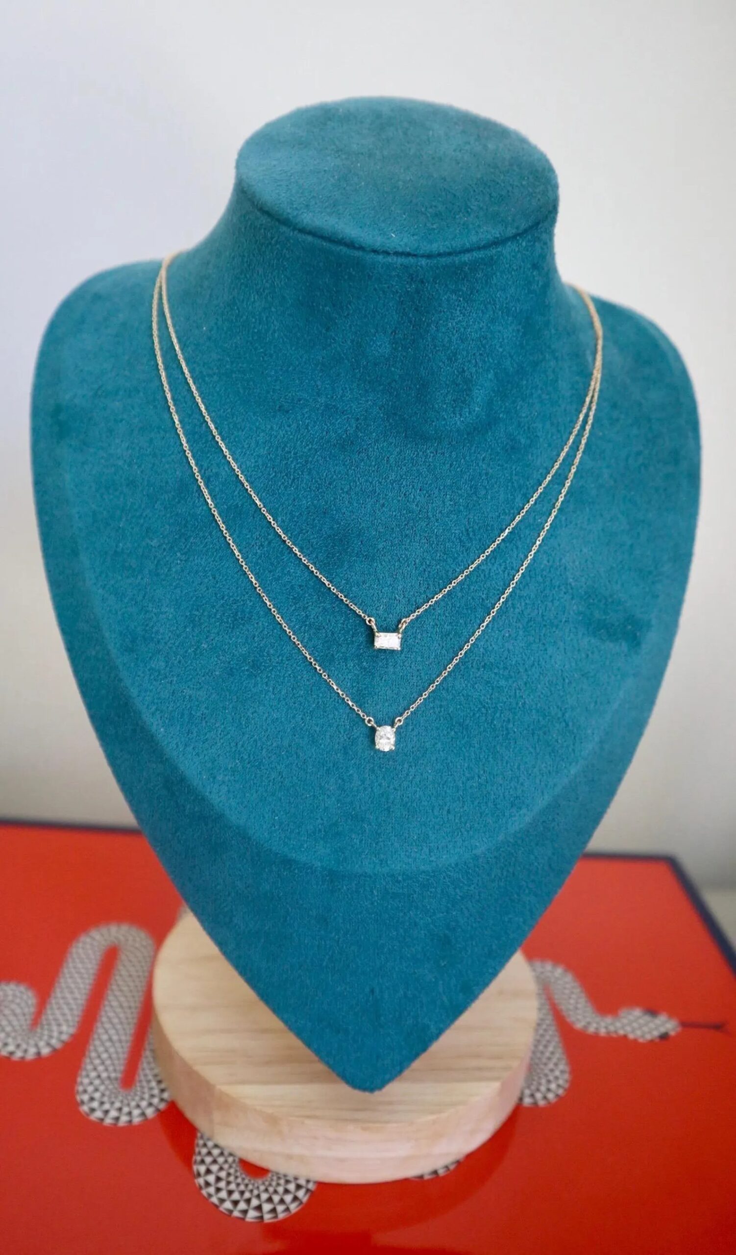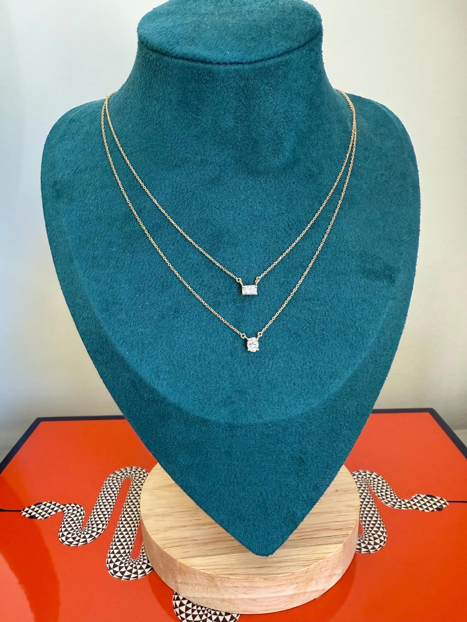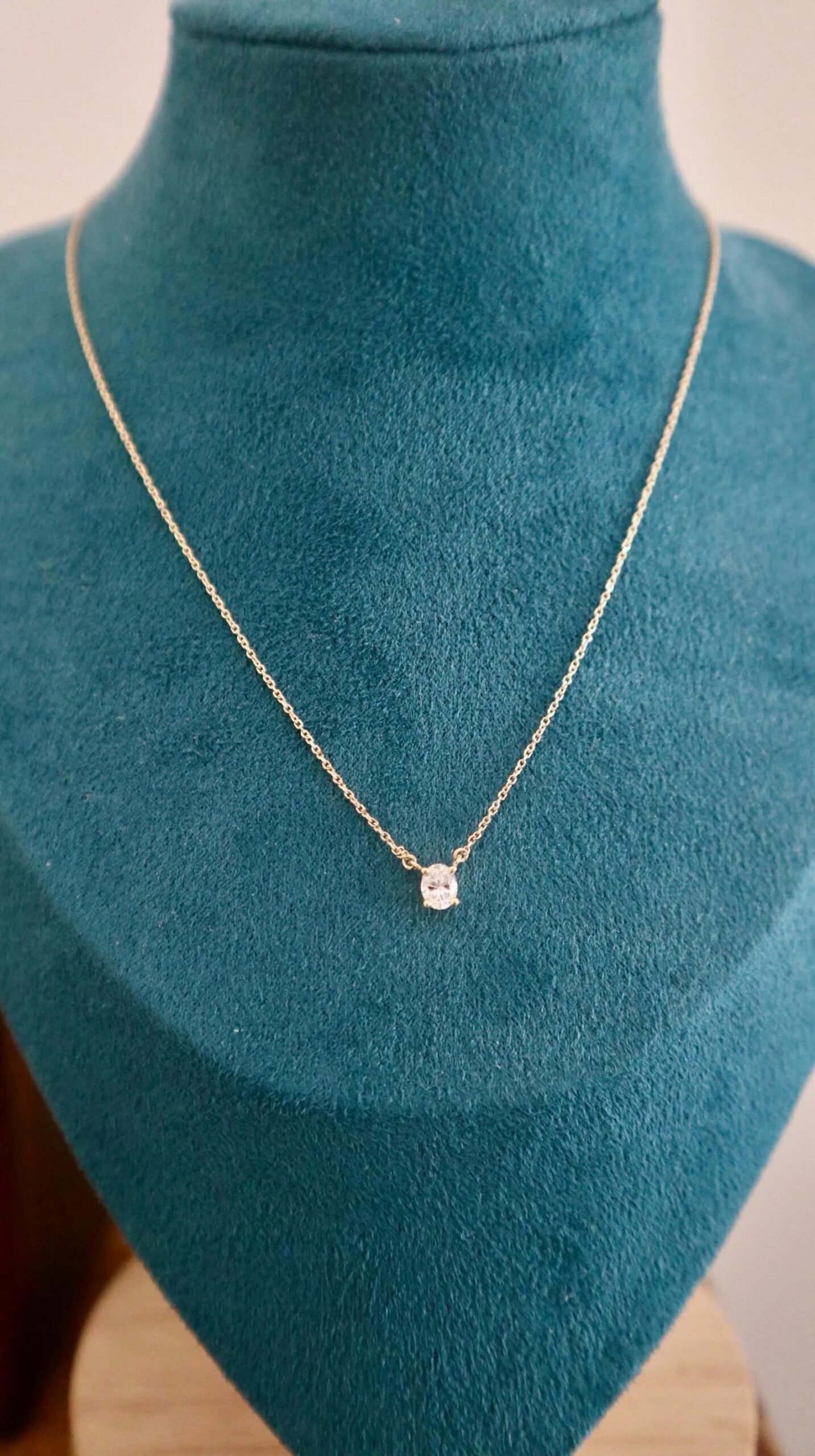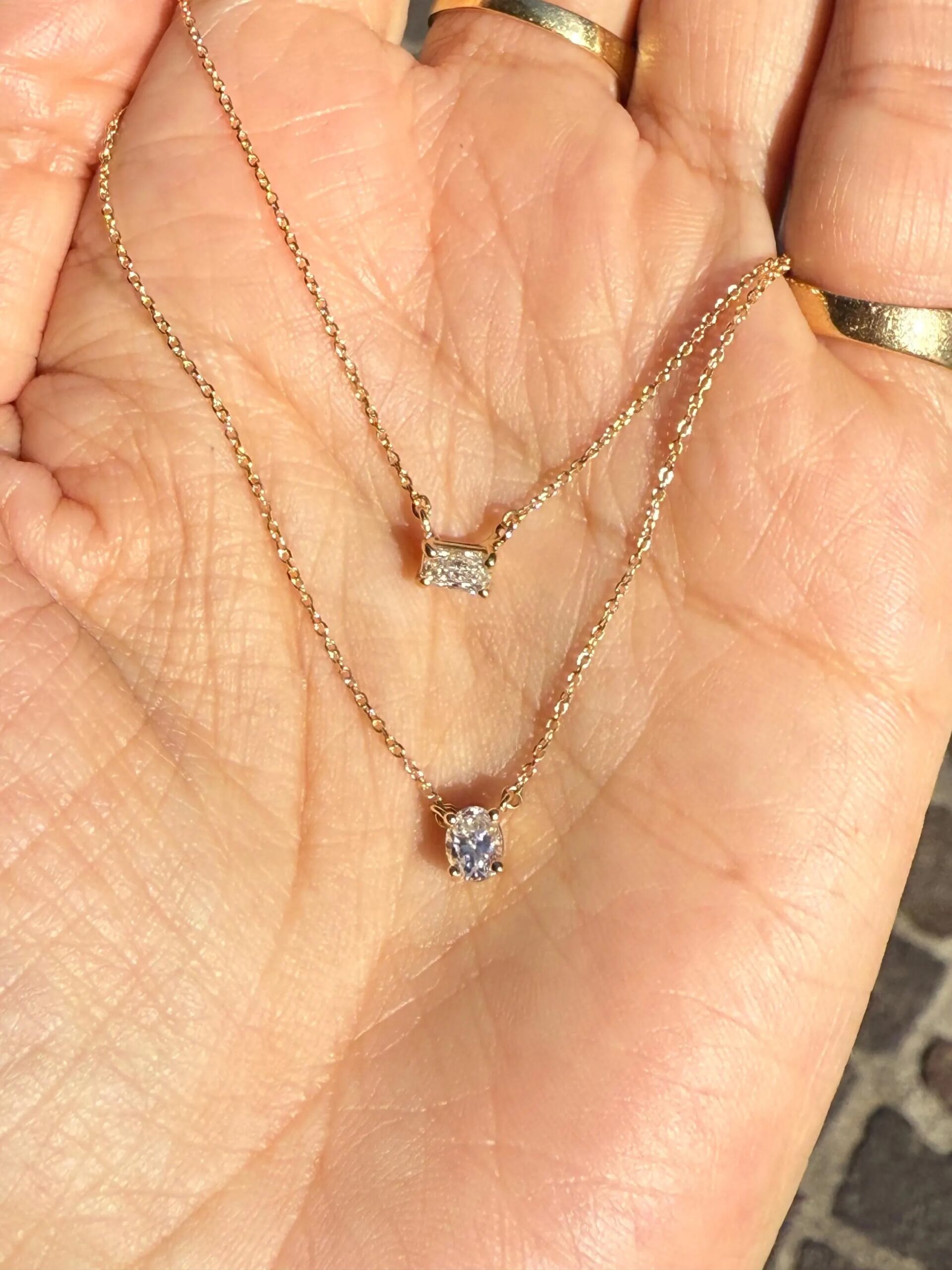 18k gold necklace with a lab-grown diamond in oval or baguette cut.