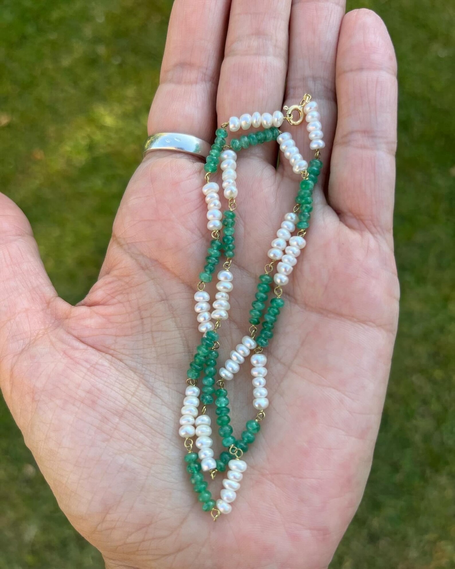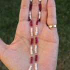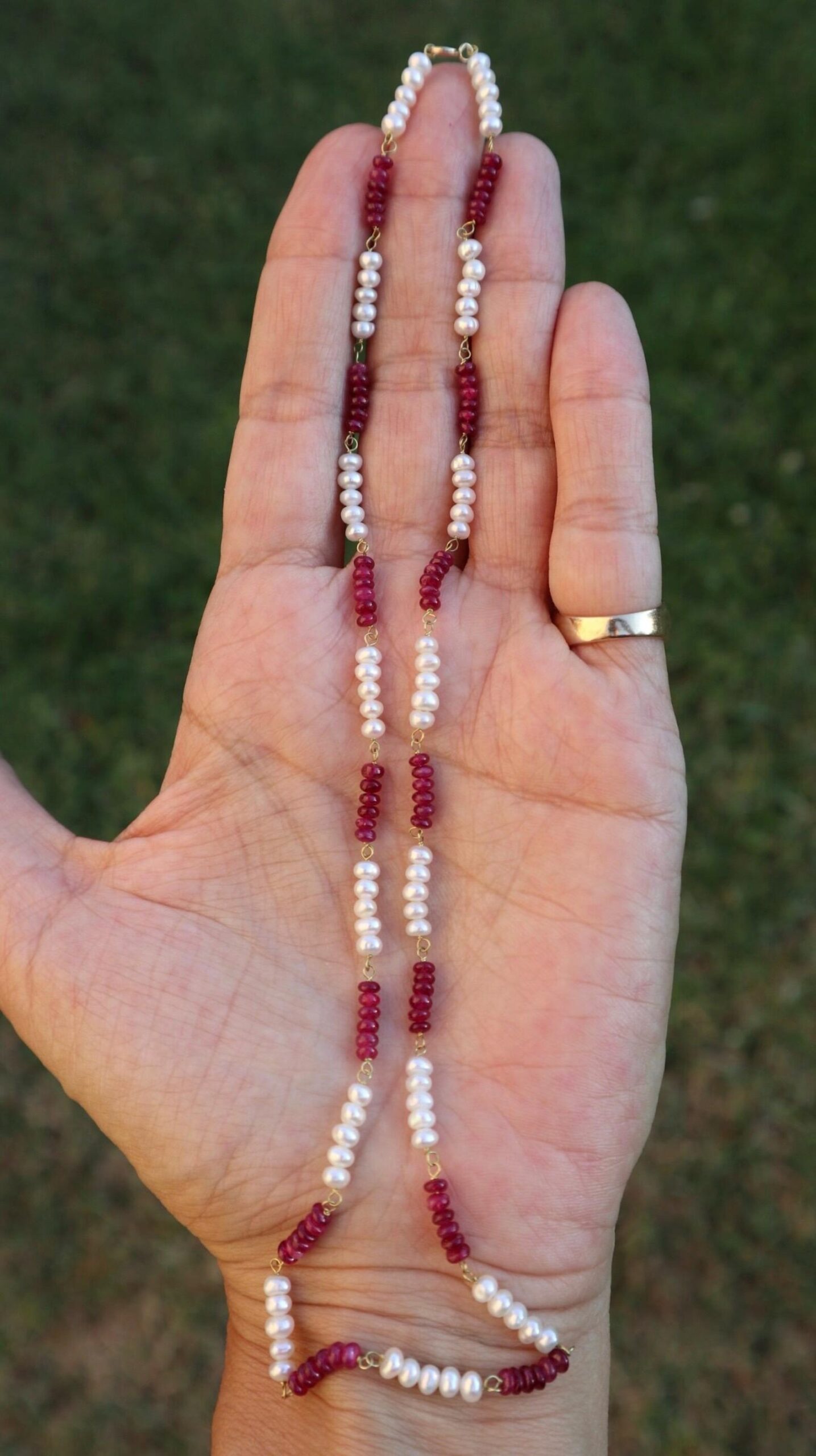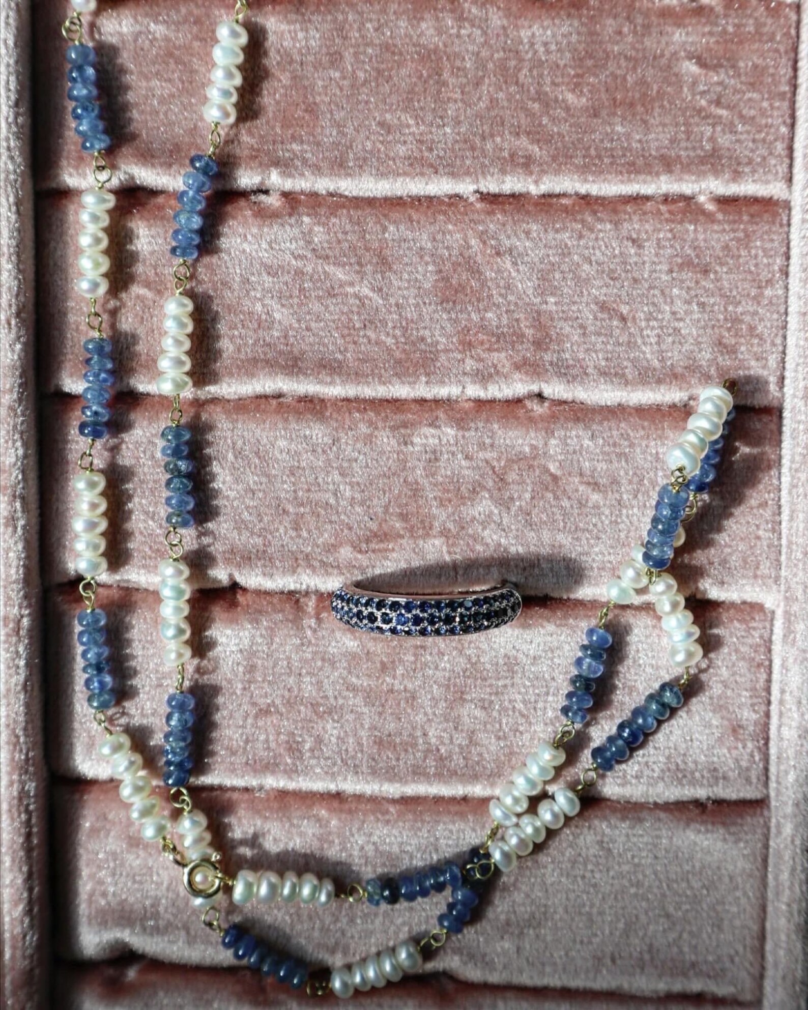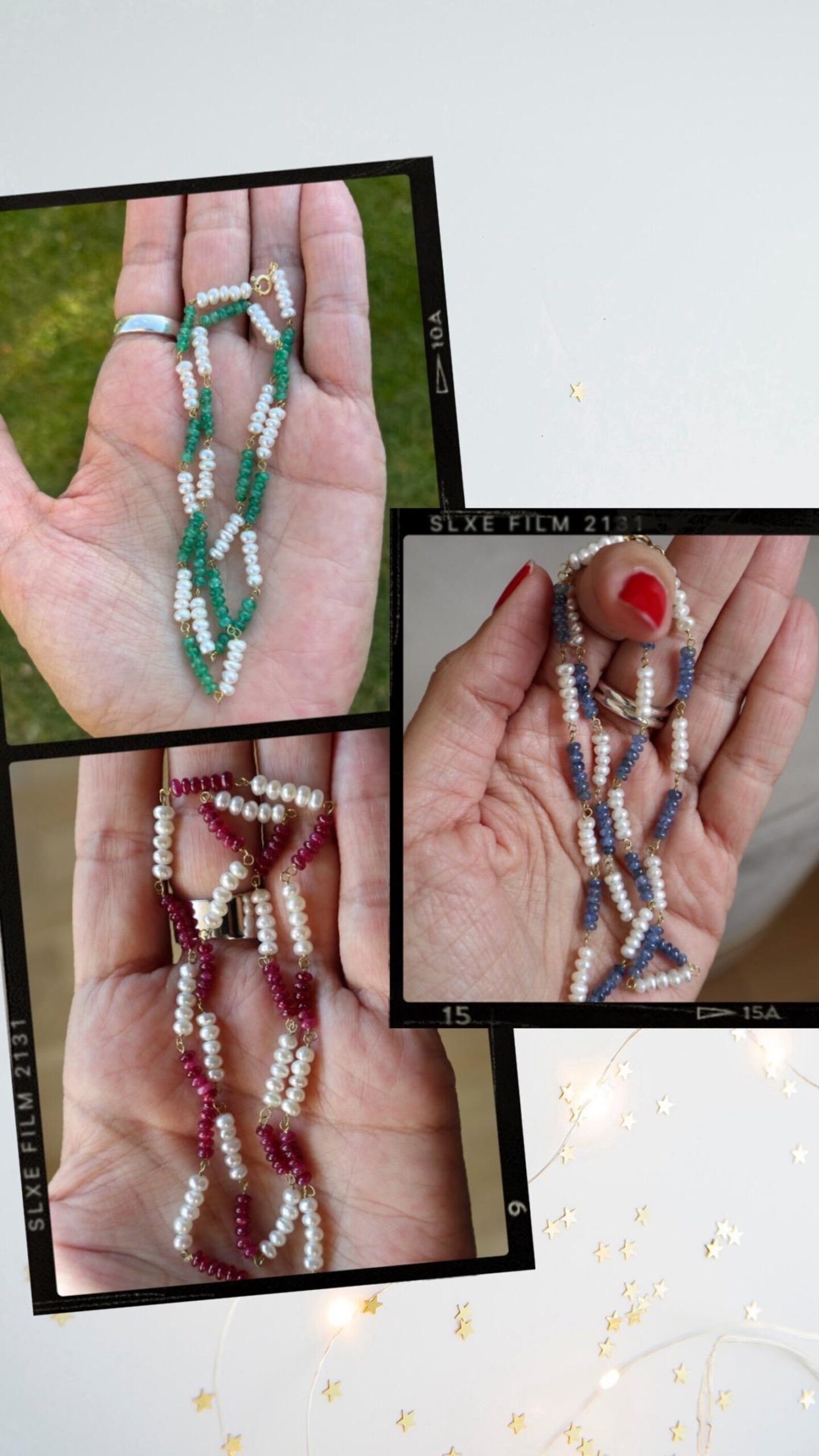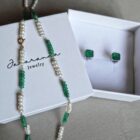 They are fine and elegant, crafted from premium materials: 18k gold and pearls with natural emerald, ruby, and blue sapphire beads, achieving spectacular tones. The stone setting is handcrafted.