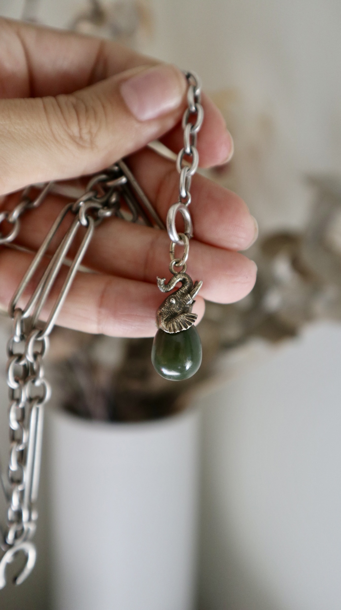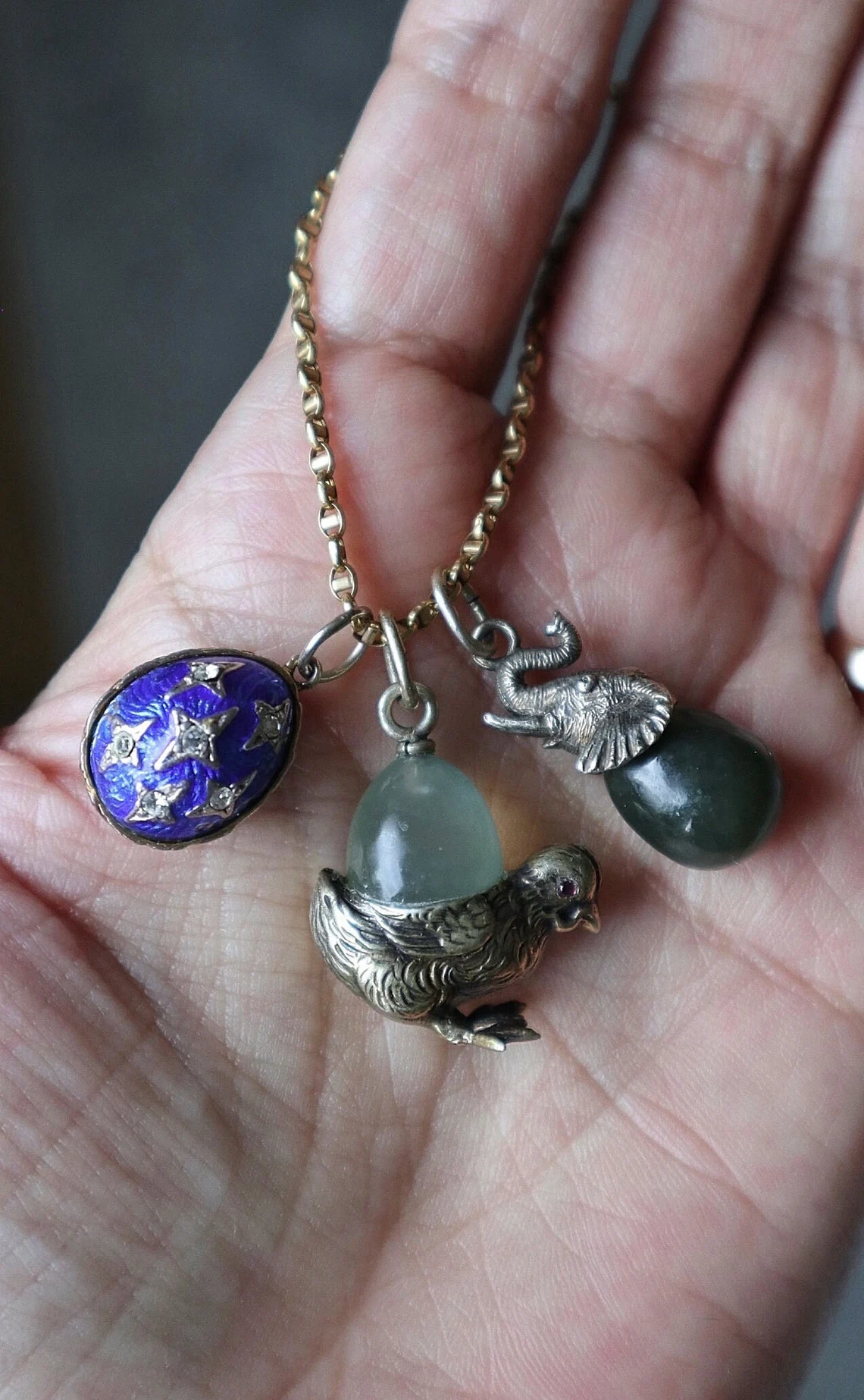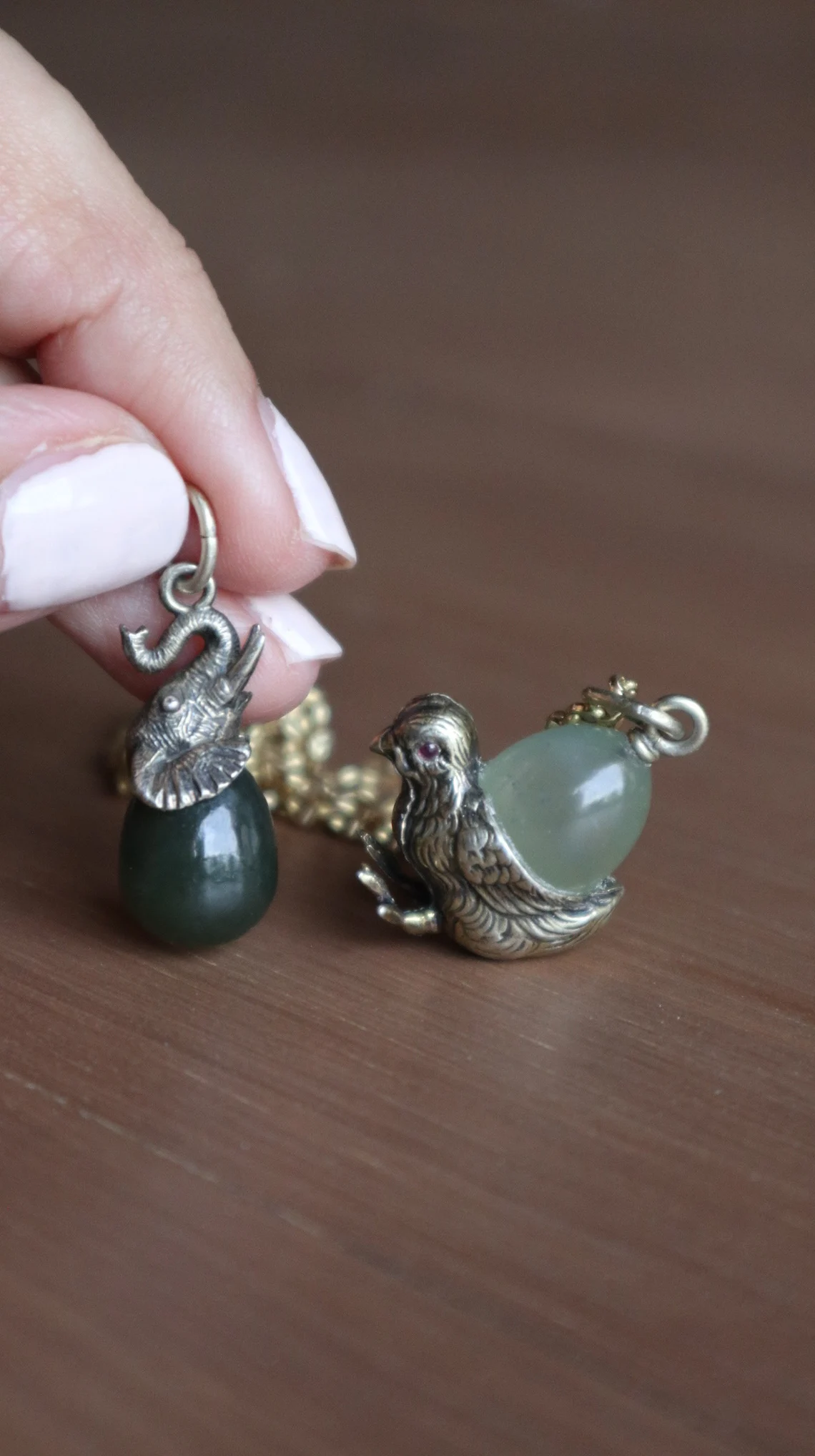 An elegant and characterful pendant featuring a hand-carved jade egg, crowned with a finely detailed elephant head in gilded silver (88 zolotnik). A piece rich in symbolism and craftsmanship, sourced for its beauty, rarity, and timeless presence.