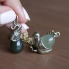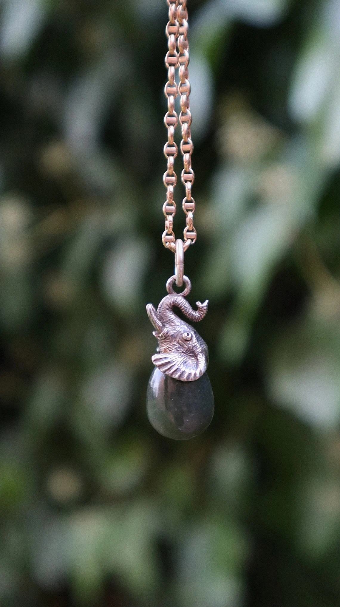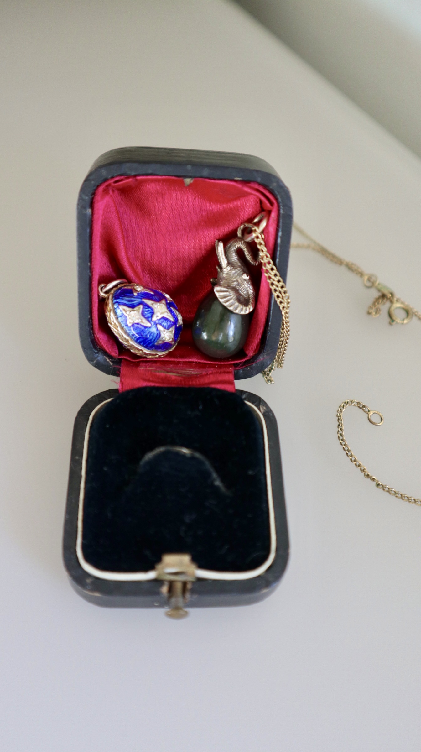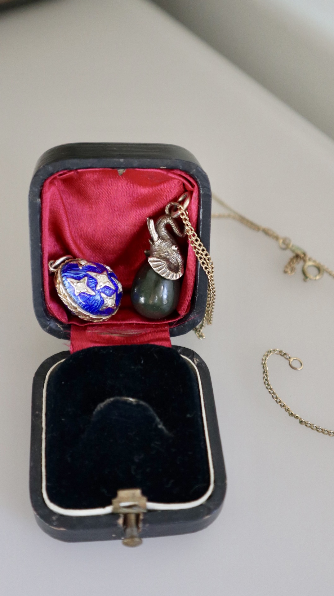 An elegant and characterful pendant featuring a hand-carved jade egg, crowned with a finely detailed elephant head in gilded silver (88 zolotnik). A piece rich in symbolism and craftsmanship, sourced for its beauty, rarity, and timeless presence.