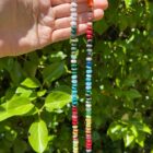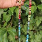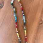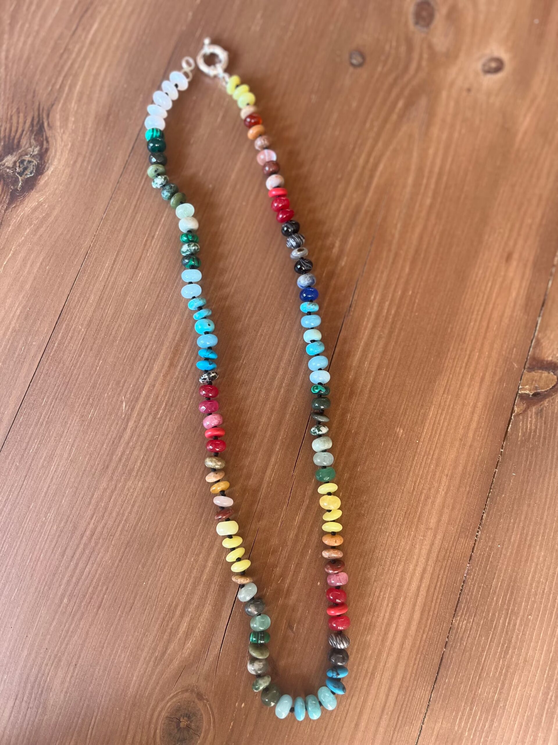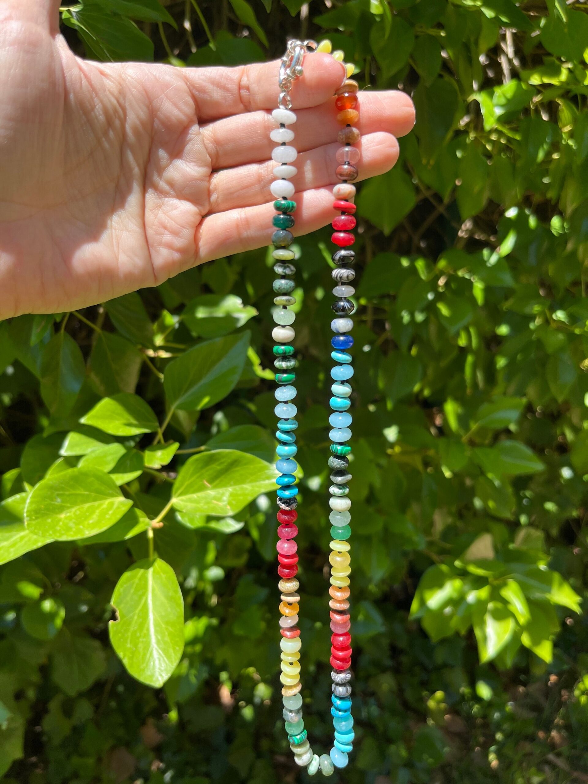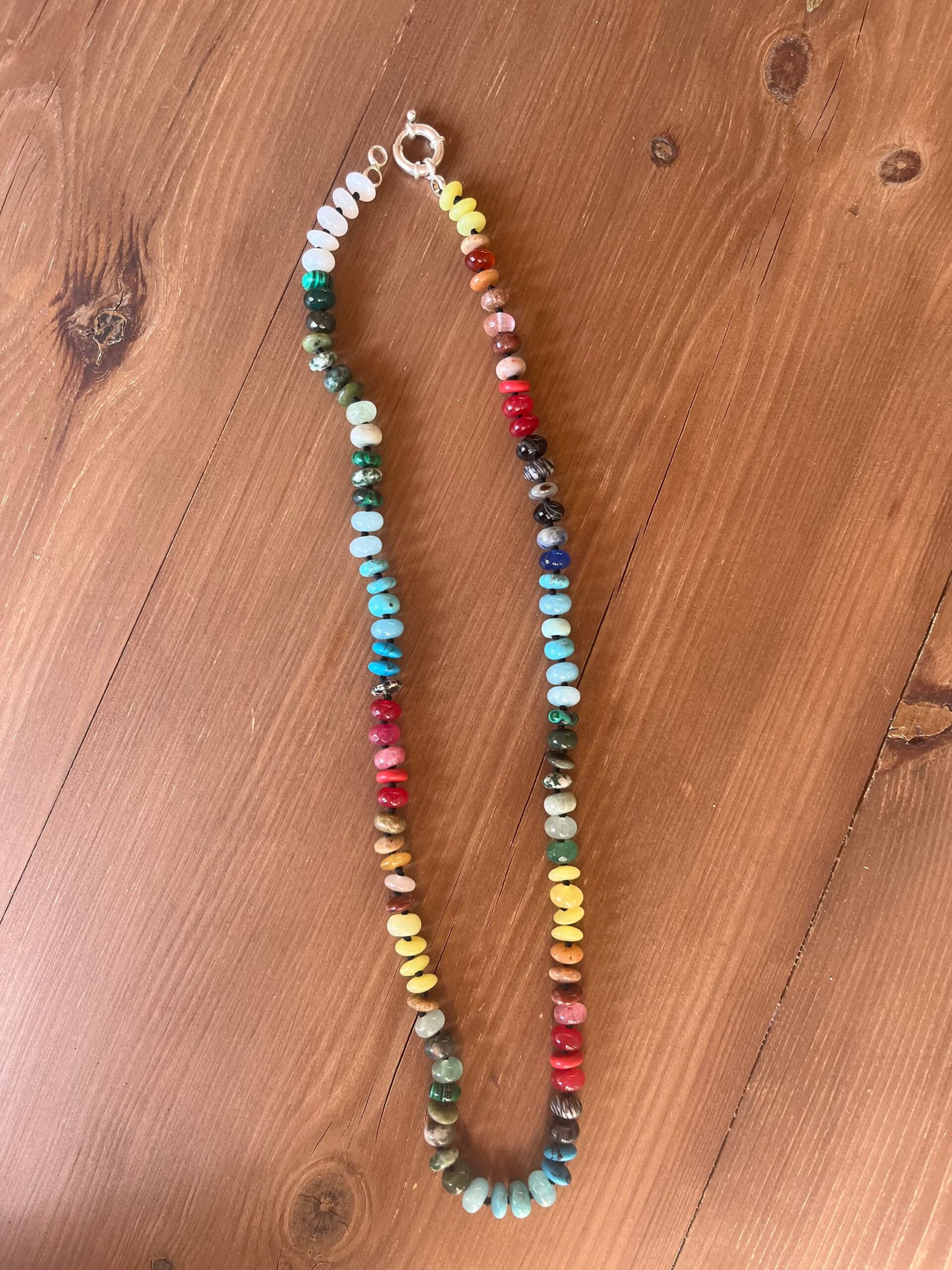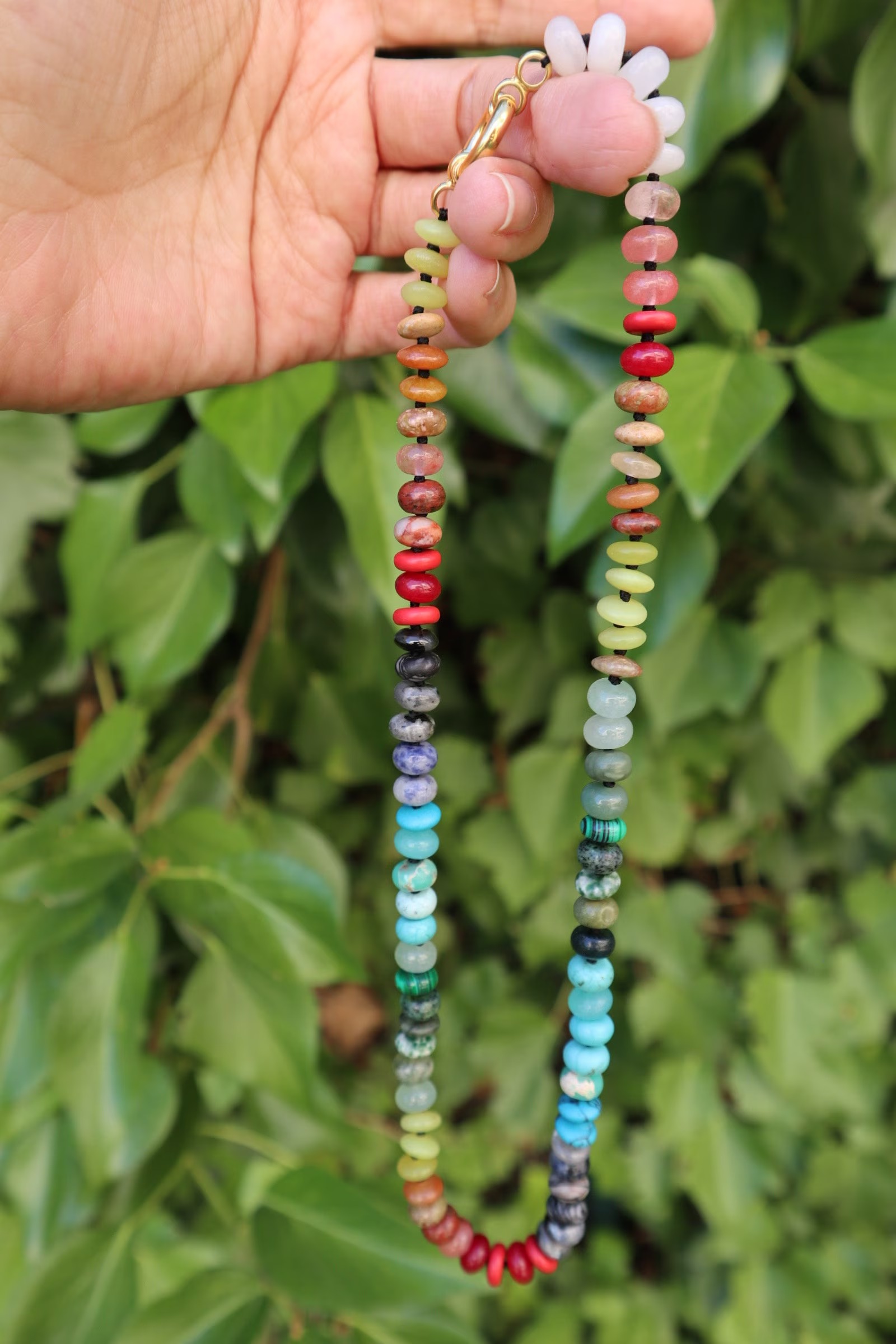 This beautiful long beaded necklace is a striking piece crafted with natural semi-precious stones arranged in a colorful and harmonious pattern.
