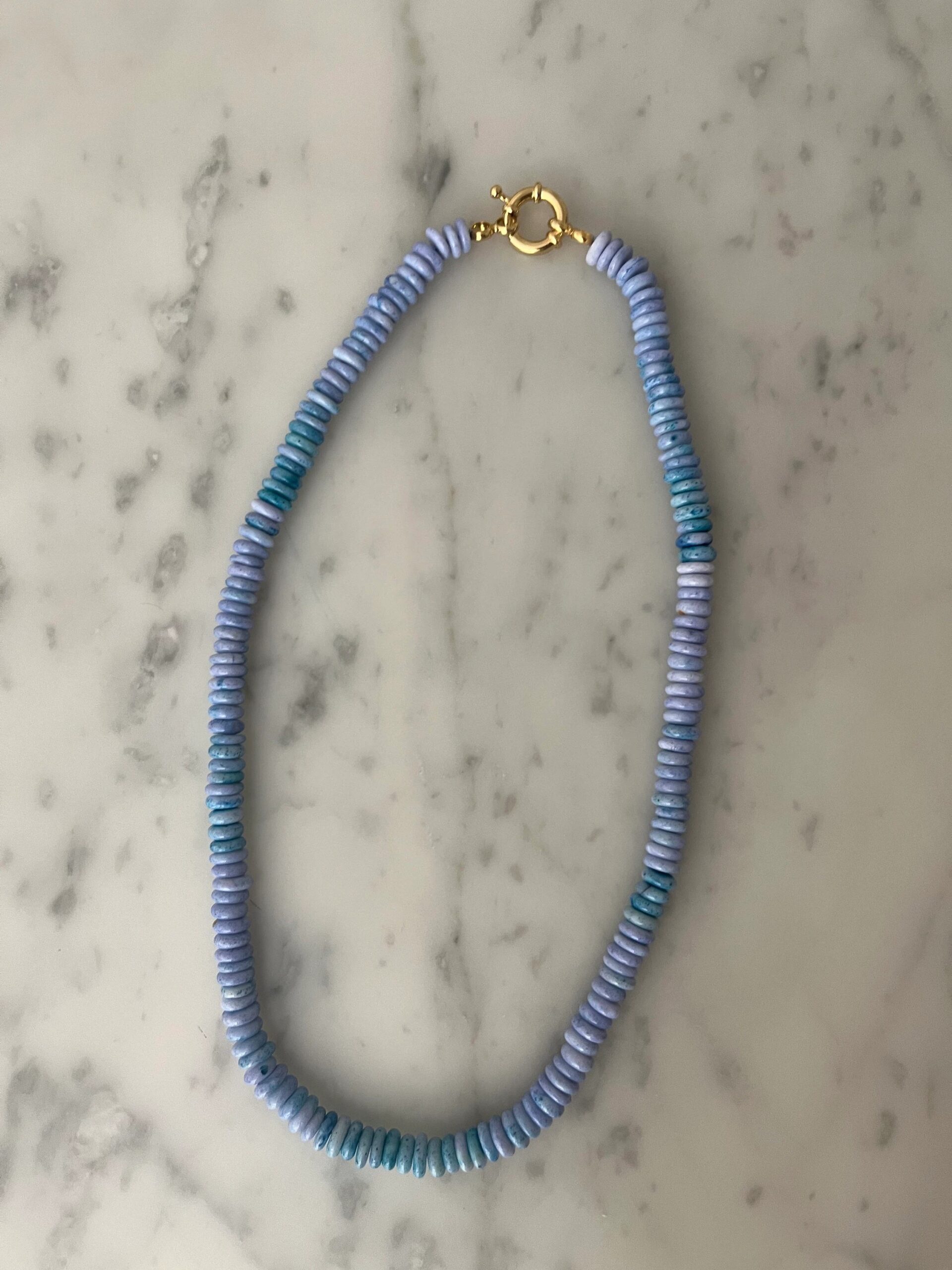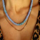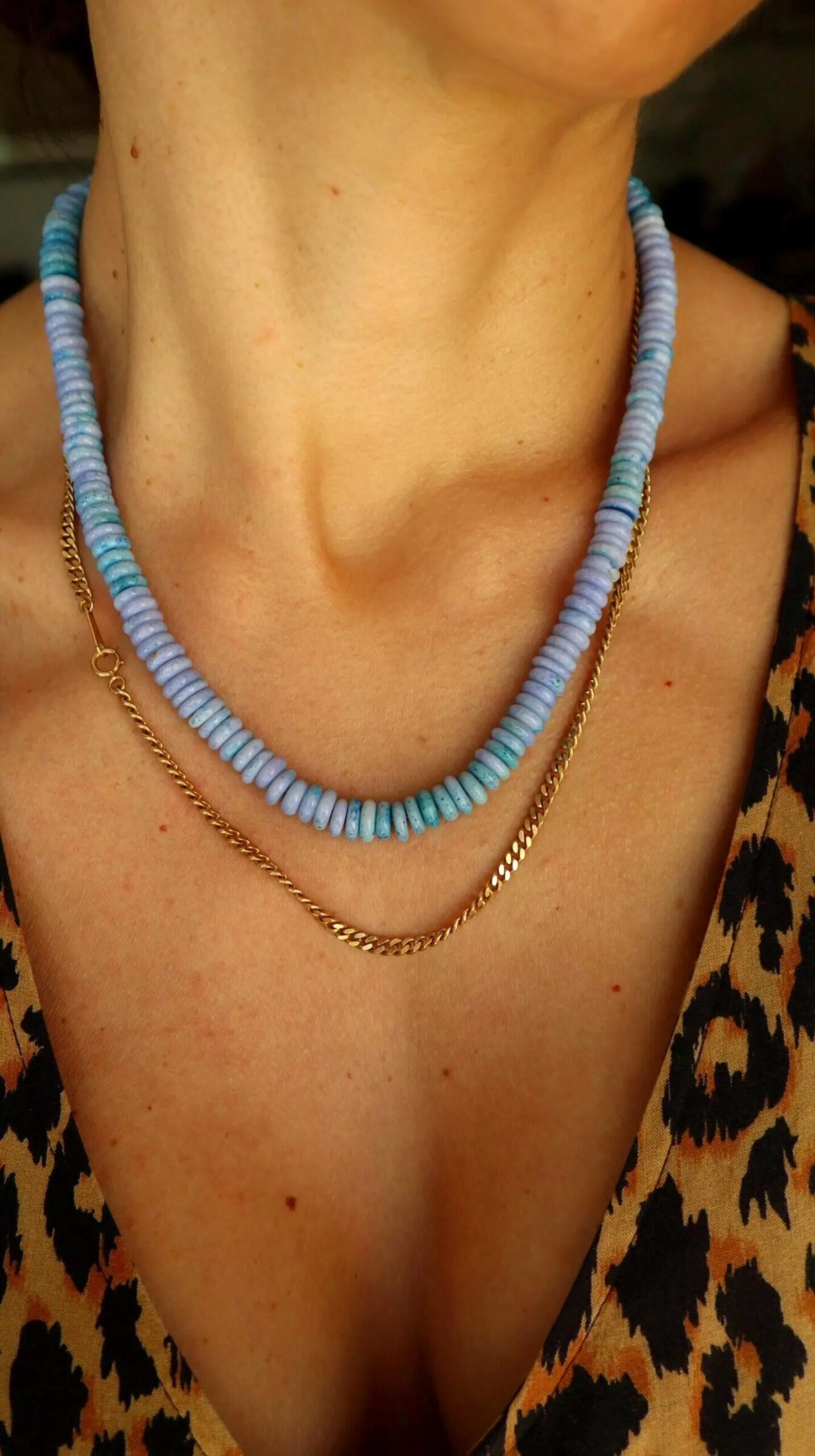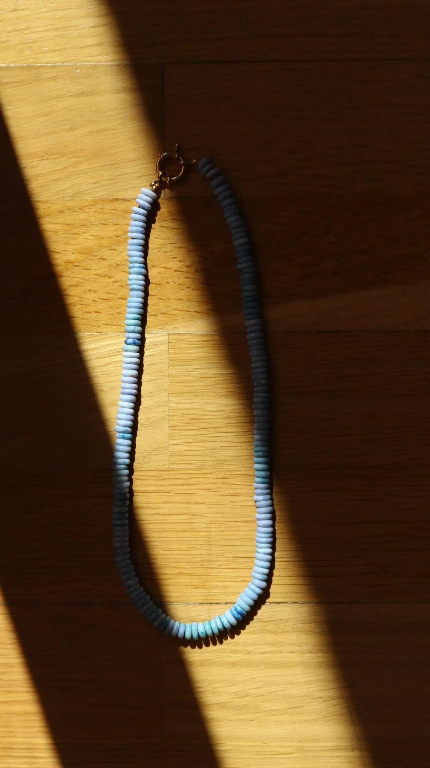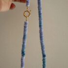 Beautiful natural opal necklace with a gold-plated silver sailor clasp. It is a very flattering piece that will undoubtedly brighten up your summer. Pendants can be hung from the clasp and worn at the front. The necklace measures 7mm wide and 47cm long.
