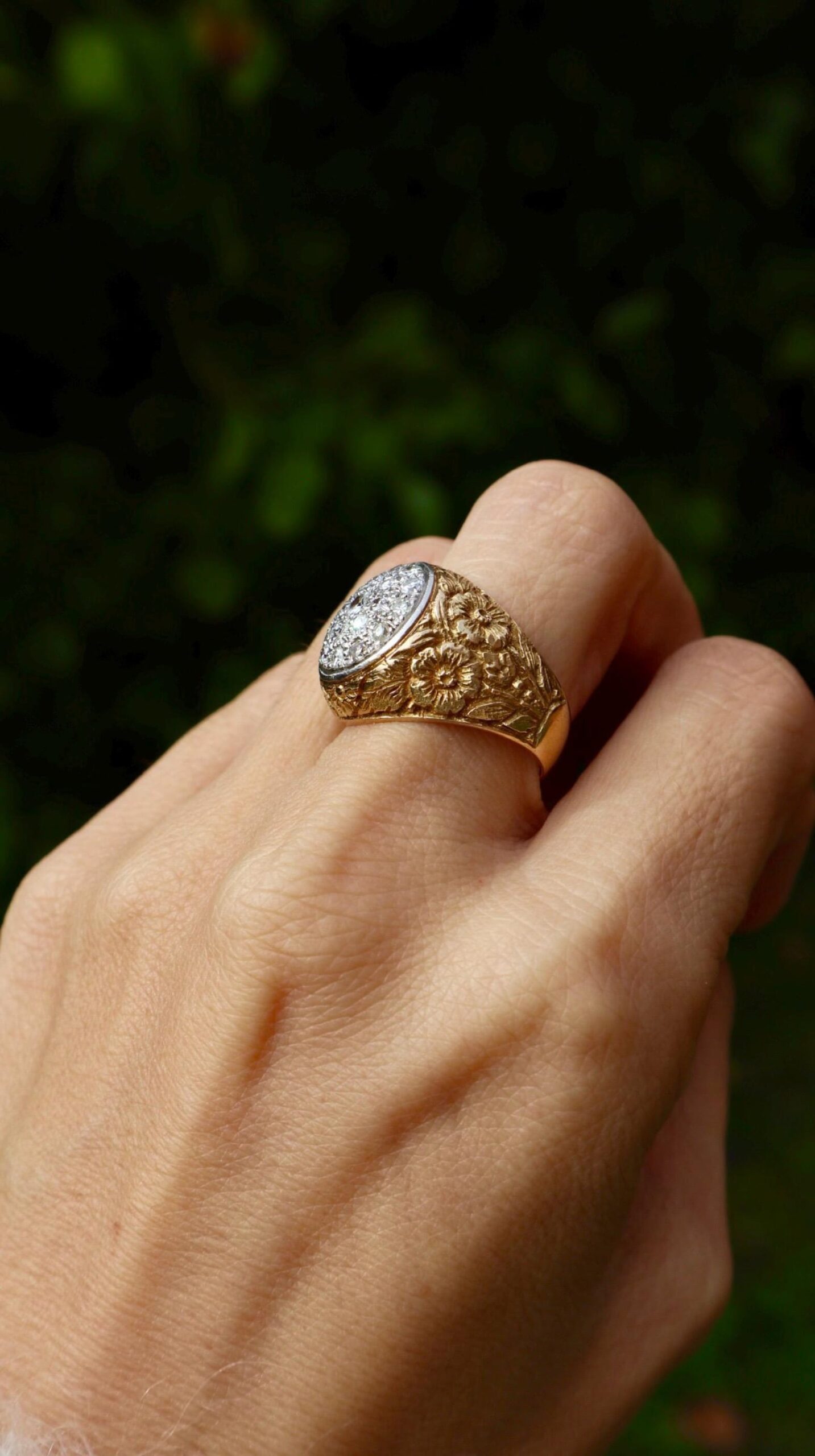 Vintage ring in 18k yellow gold with diamonds with beautiful hand engraved diamonds